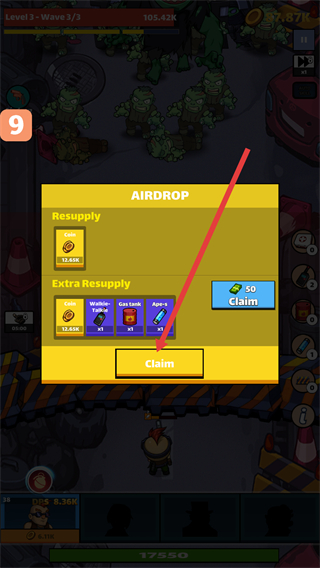 4、点击空投界面的Claim按钮,领取补给道具继续推进关卡。