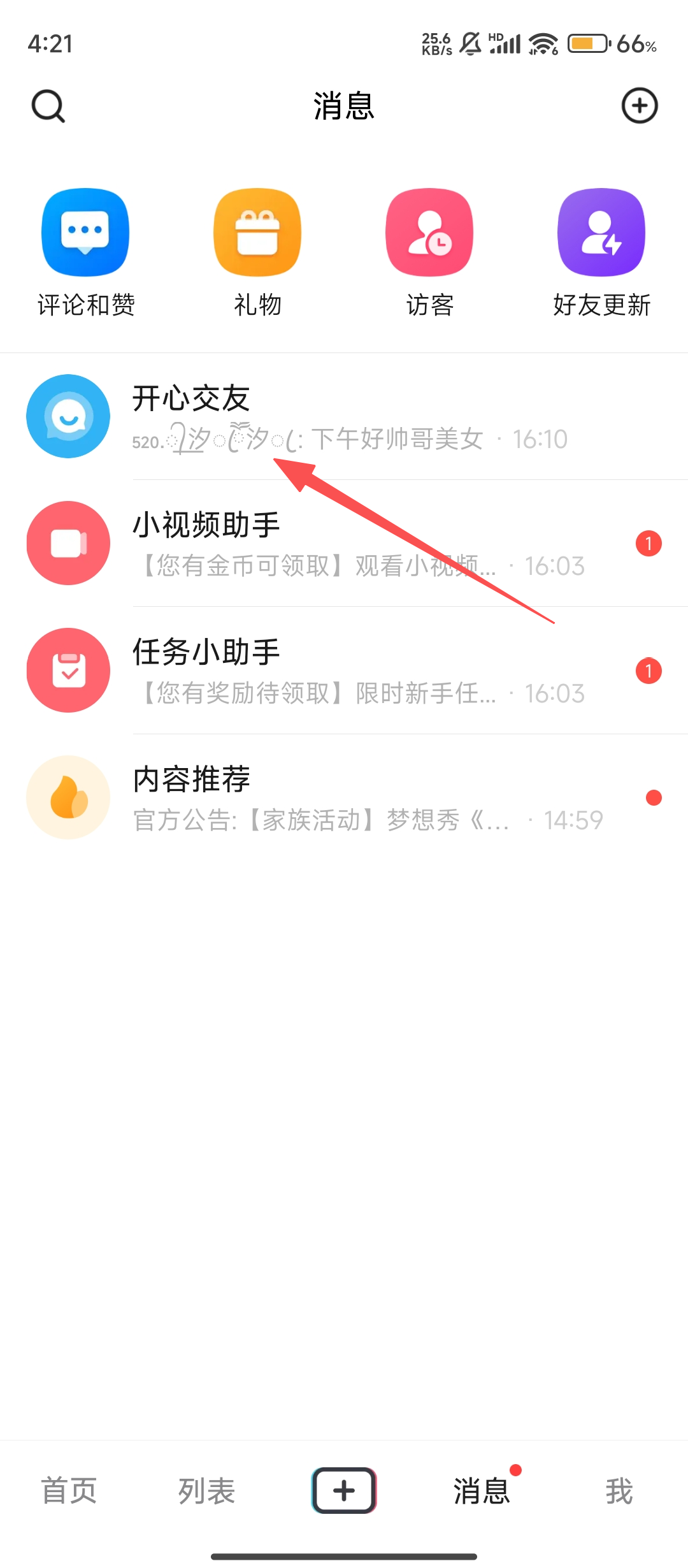 2、在消息页面,找到【开心交友】选项并点击,就能进入交友相关界面啦。