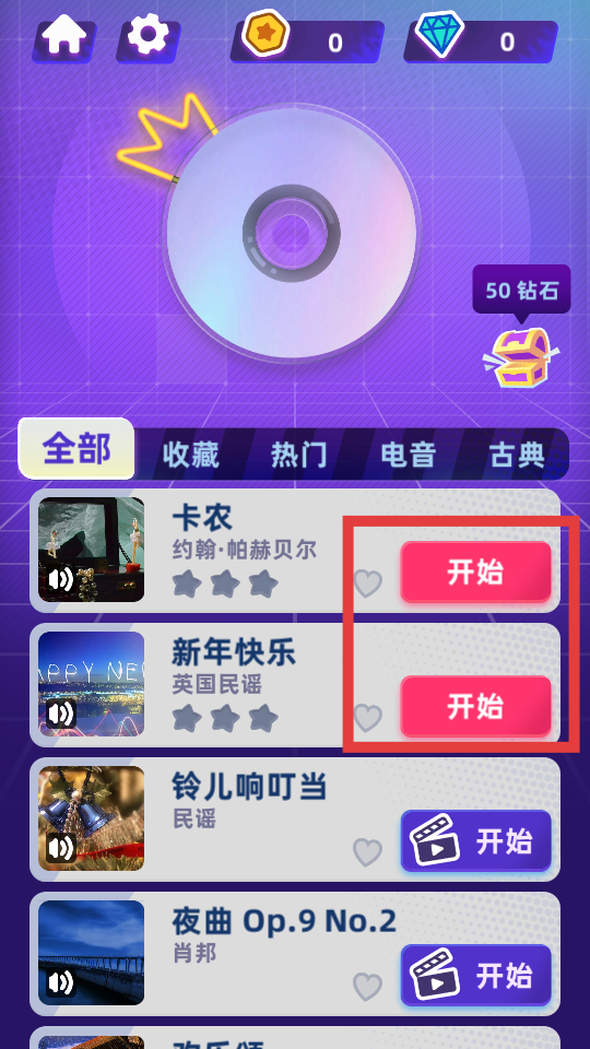 1、在歌曲列表选《卡农》《新年快乐》等,点击对应【开始】按钮进入游戏。