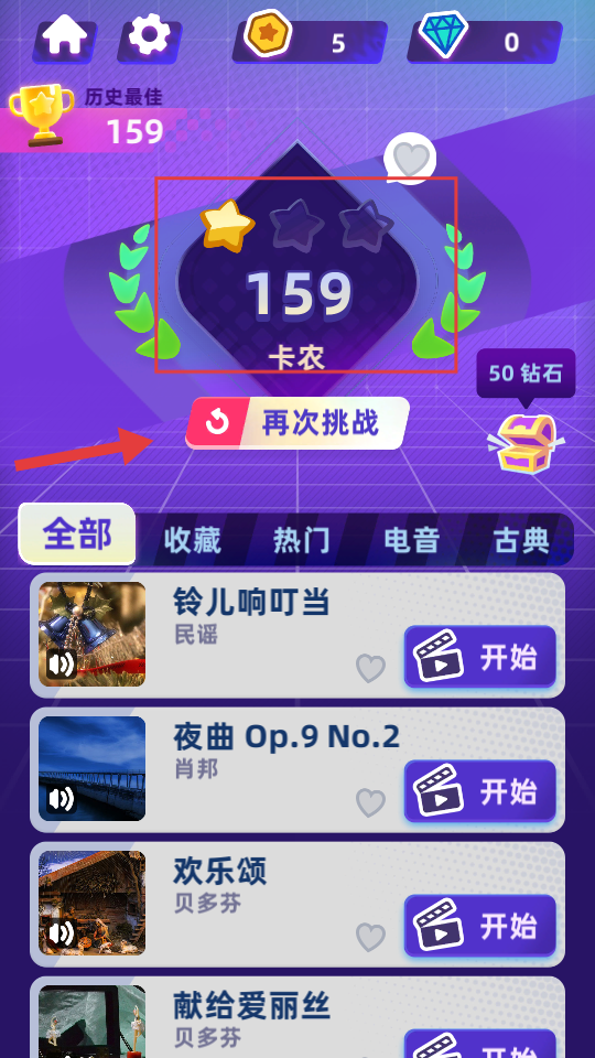 4、游戏结束后,查看《卡农》等歌曲的得分,可点击【再次挑战】或选其他歌曲。