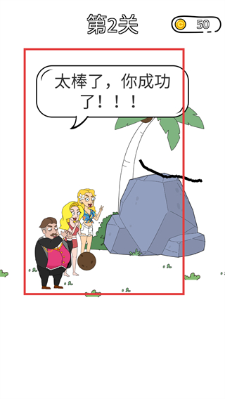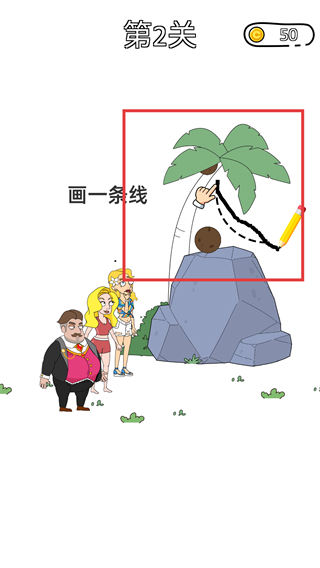 1、第2关中,按提示画一条线切断椰子的悬挂处,让椰子掉落,完成该关卡的解谜任务,推进游戏进度。