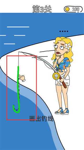 3、第3关中,按提示画出钓线,使鱼钩能接触水面,帮助角色完成钓鱼操作,需画出合理的线条形状以达成目标。