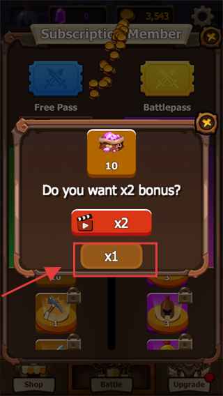 1、在奖励选择界面,点击【x1】按钮领取基础奖励,无需观看视频即可获得【10】的道具,快速提升初期资源。