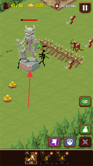 2、战斗场景中,需保护【雕像】免受红色火柴人进攻,利用栅栏阻挡敌人,同时维持【42-50】人口确保战力。