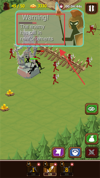 3、看到【Warning-Theenemyhascallinreinforcements】提示时,立即调动士兵加固防线,阻挡新增红色火柴人增援。