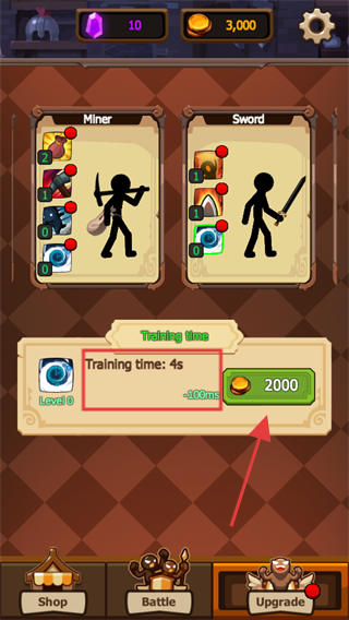 4、升级界面里,消耗【2000】金币缩短【Miner-Sword】士兵的【Trainingtime-4s】,加快部队训练速度。