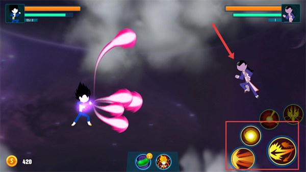 1、战斗中,点击红色框内的技能按钮,对红色箭头指向的敌人发起攻击,消耗其生命值。