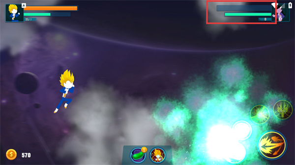 2、当自身能量值(红色框内)下降时,点击红色箭头指向的变身技能按钮,变身增强战力并恢复全部能量值。