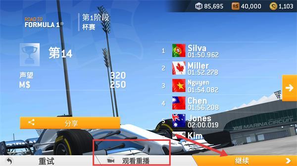 1、在比赛结算界面,点击【观看重播】按钮,进入计时赛的回放播放界面。