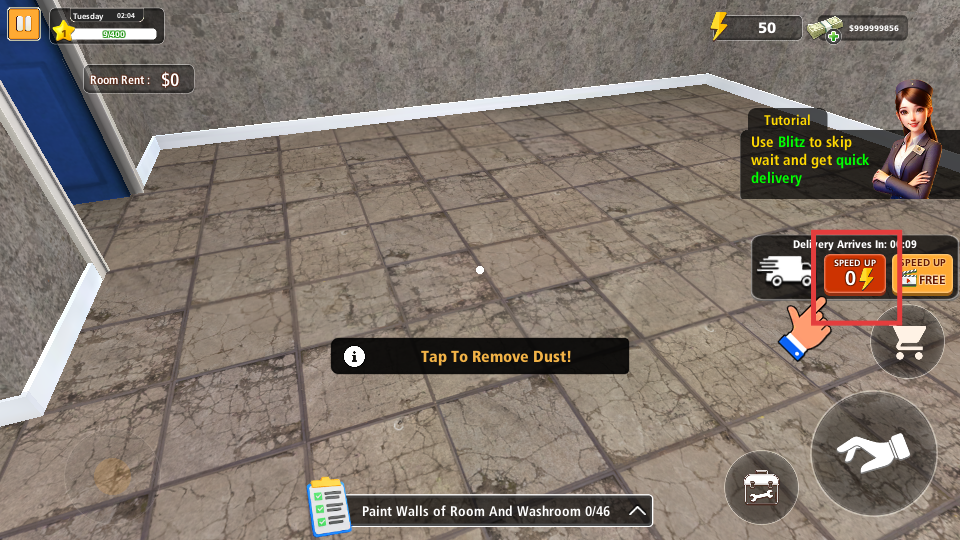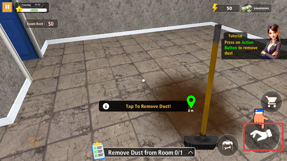 1、点击动作按钮,去除房间灰尘,完成清洁任务,推进游戏进程。