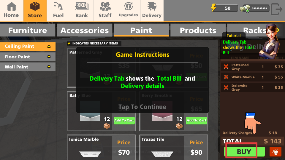 2、在商店界面点击【BUY】按钮,购买所需物品,获取游戏资源。