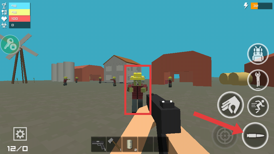 3、遇到僵尸(如戴黄色帽子的僵尸)时,点击射击按钮消灭它们,保障自身安全。