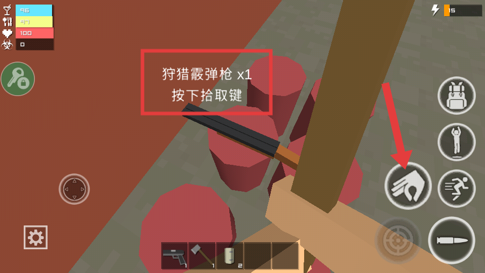4、发现“狩猎霰弹枪”等资源时,点击交互按钮拾取,提升自身战力,与其他玩家协同在僵尸世界中生存发展。