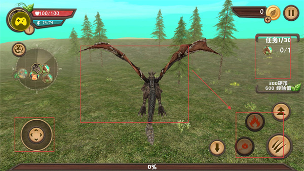 2、进入场景后,通过左侧摇杆控制龙的移动,右侧技能键(如火焰攻击)可对目标造成伤害,优先完成任务目标以获取资源。