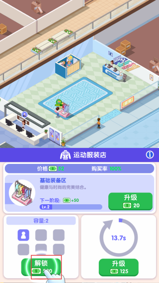 4、在运动服装店点击【解锁】,拓展店铺的运营功能。