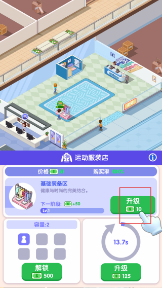 3、在运动服装店点击【升级】基础装备区,提升店铺对应属性。