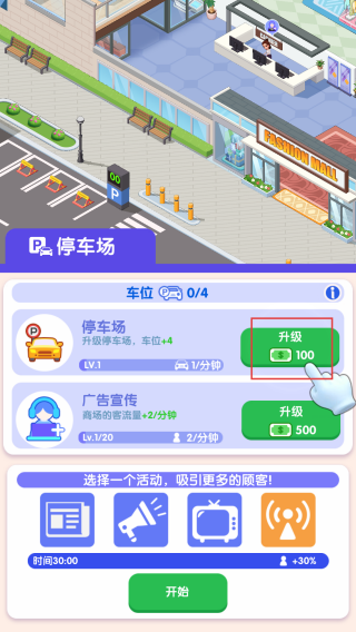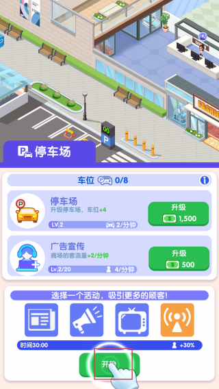 1、在停车场界面消耗钞票升级停车场,推进商场运营进程。