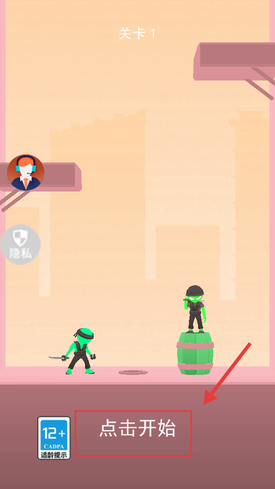 1、进入【关卡1】界面,点击底部红色框内的【点击开始】按钮,开启关卡挑战。