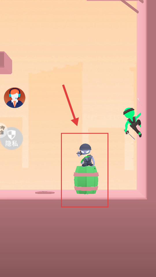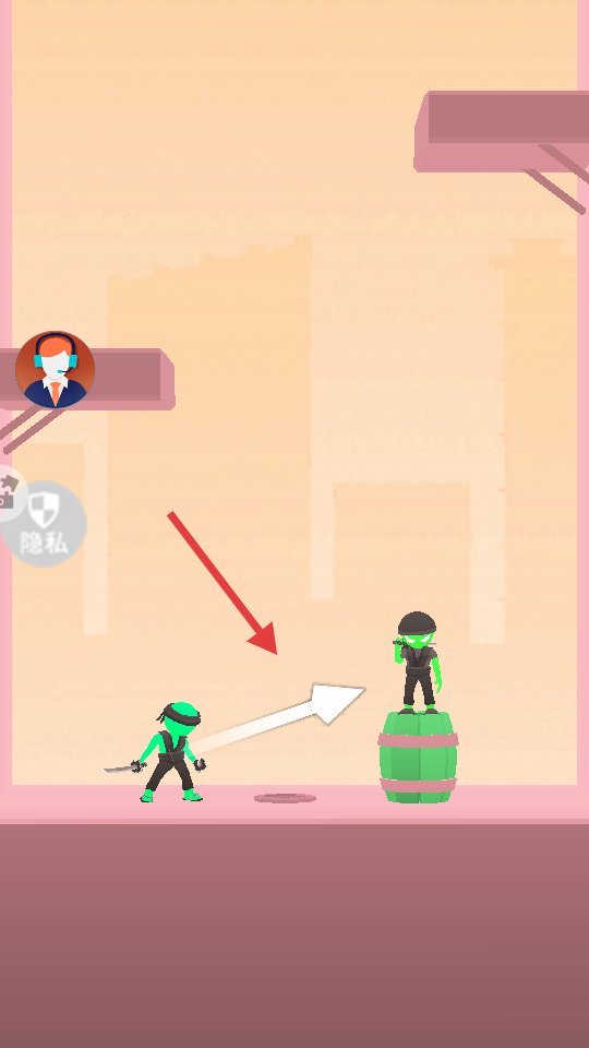 2、根据红色箭头提示,操控左侧持剑【忍者】,按白色箭头方向攻击高处【绿色-木桶】上的敌人。