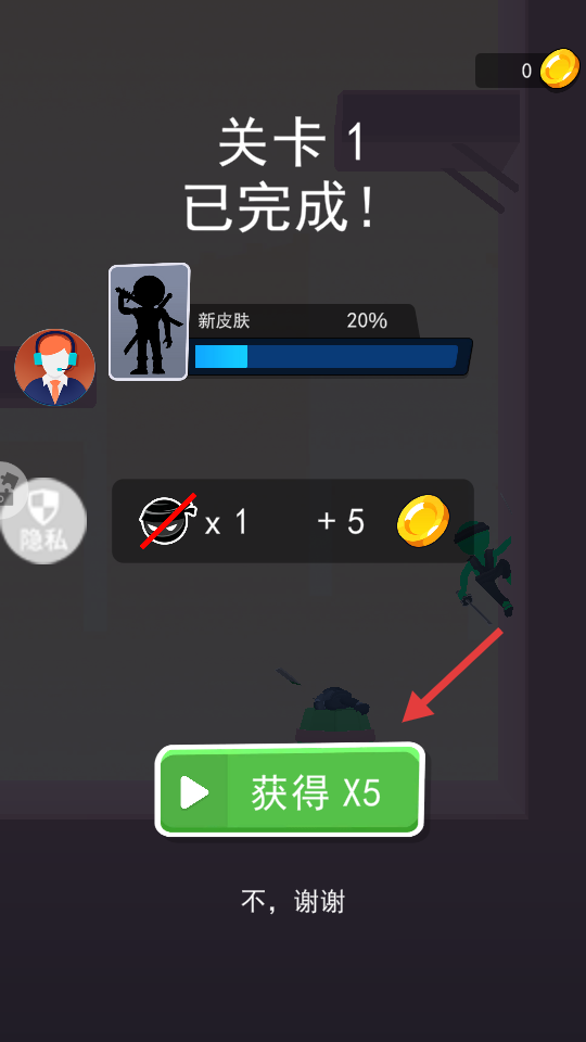 4、【关卡1】完成,可点绿色【获得X5】领5倍奖励,或选【不,谢谢】直接继续。