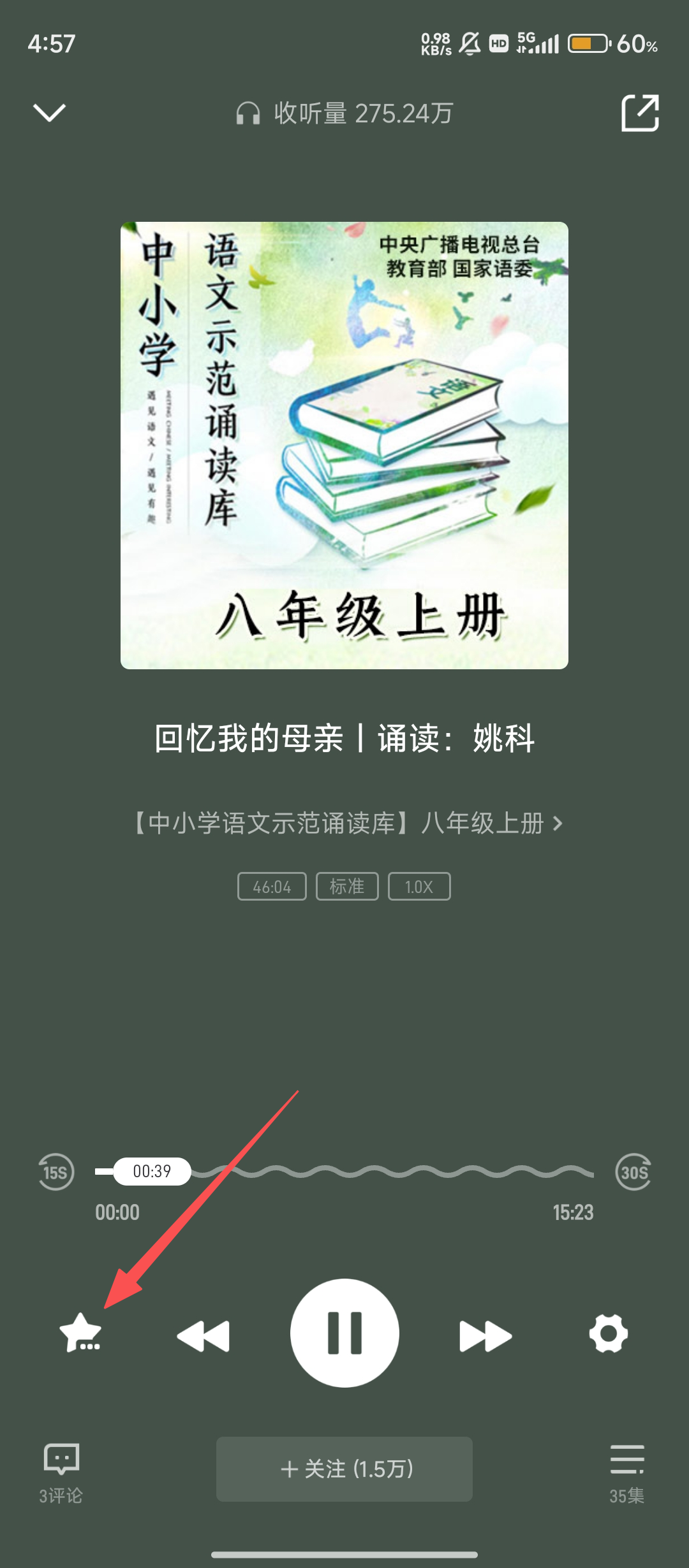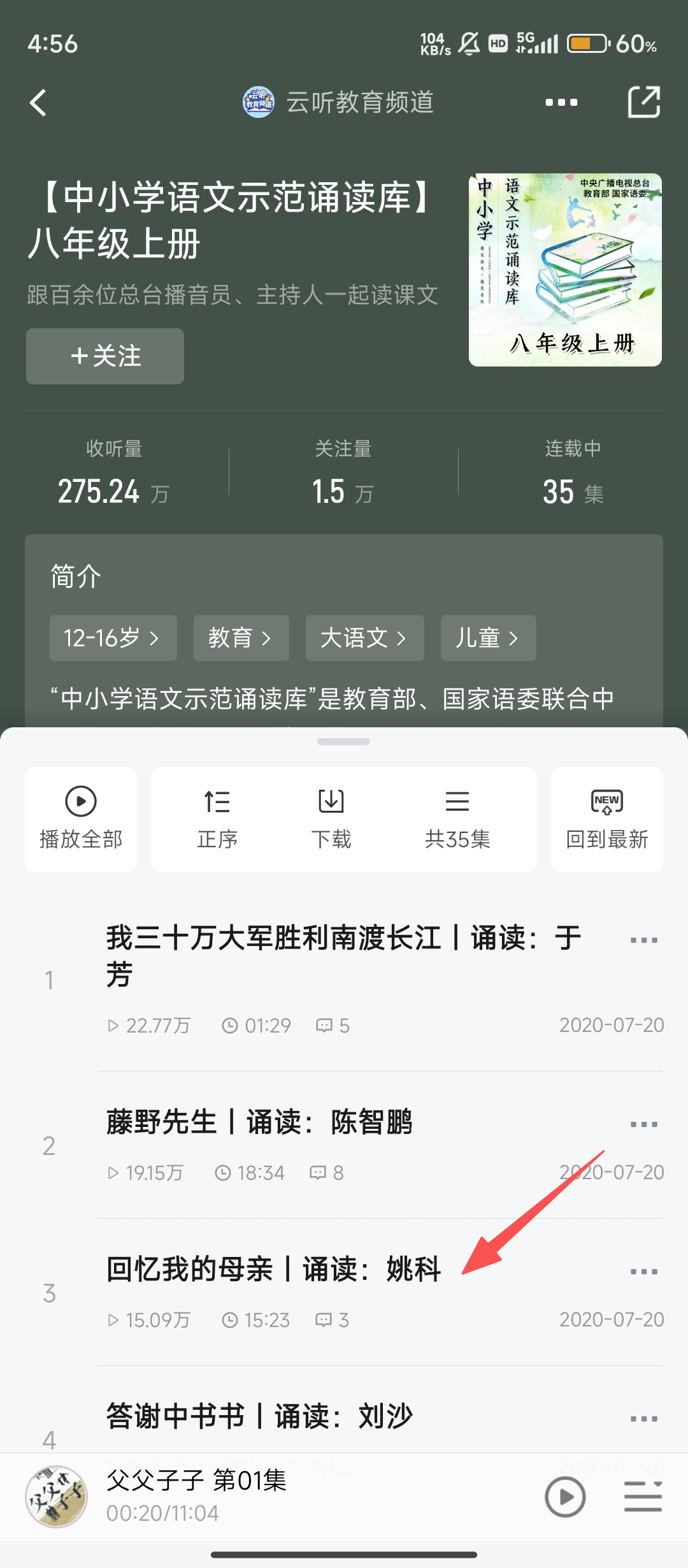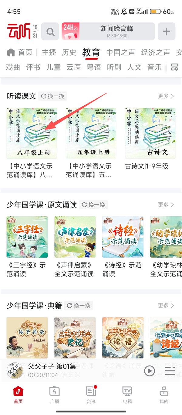 1、打开云听,在教育板块找到【中小学语文示范诵读库-八年级上册】并点击,开启内容收藏的第一步。