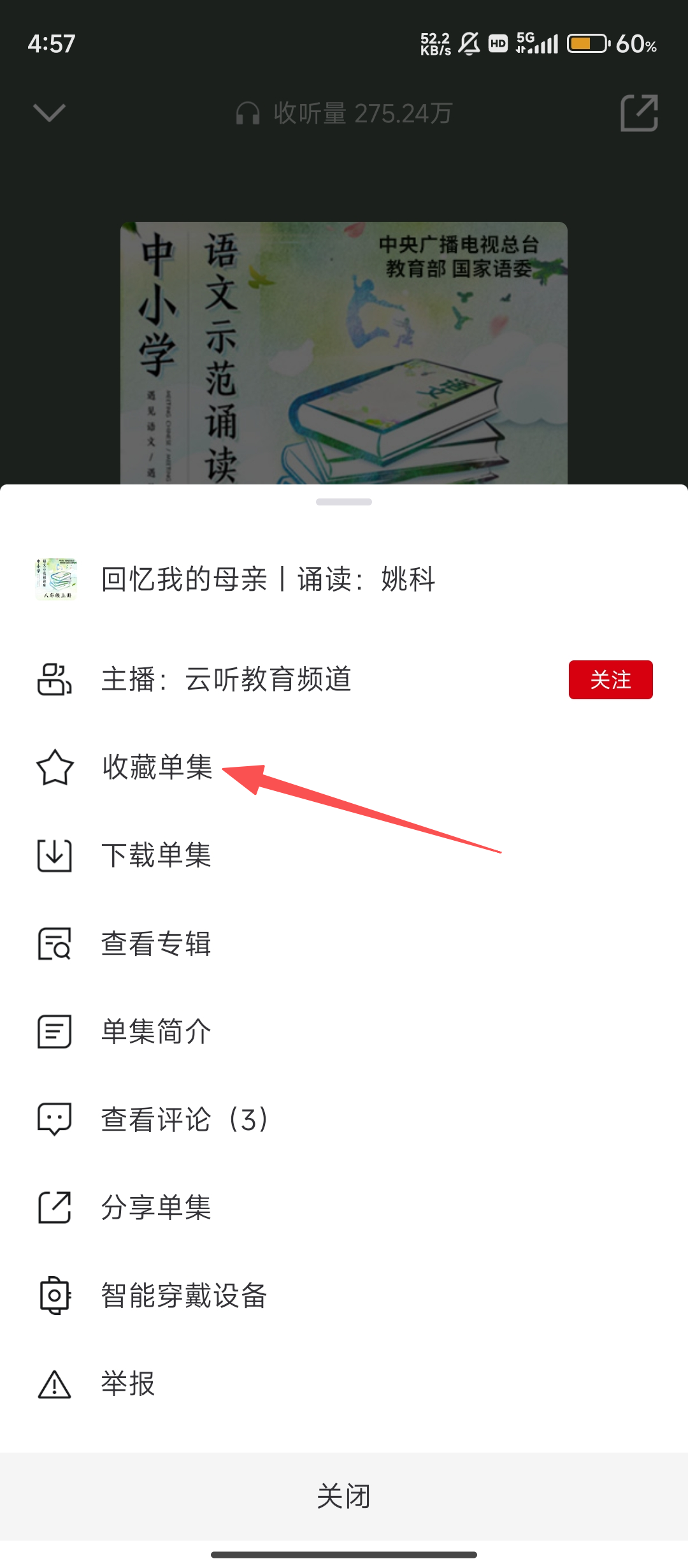 4、在弹出的菜单中,点击【收藏单集】,即可将该内容收藏,方便后续随时收听,完美收官。
