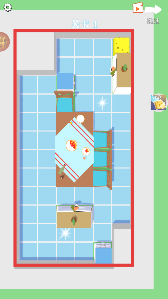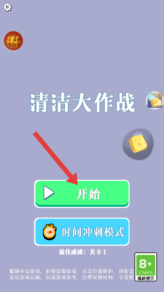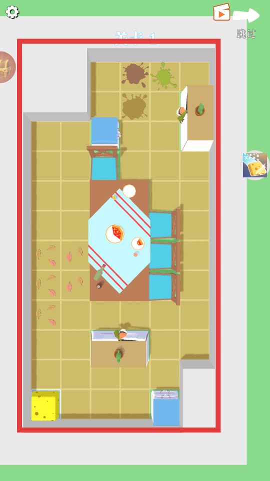 2、进入【关卡-1】后,观察【红框内】杂乱且有污渍的房间布局,【上下左右】滑动屏幕进行清洁。