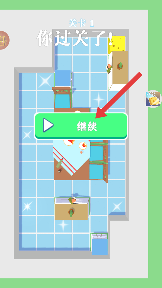 4、成功清理完成,显示【你过关了!】后,点击【继续】按钮,挑战下一关卡。