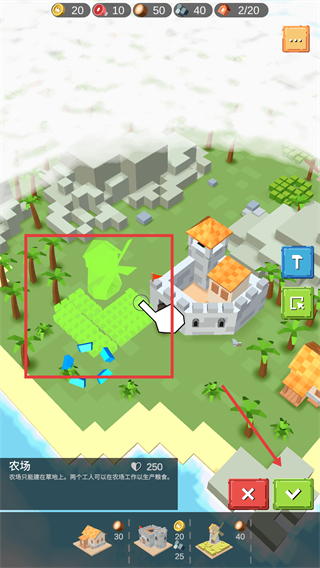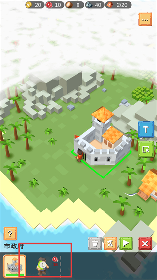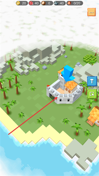 1、初始界面显示岛屿场景与资源(20金币、40红心等),核心建筑为城堡,需先规划建筑布局,利用资源开启基础建设。