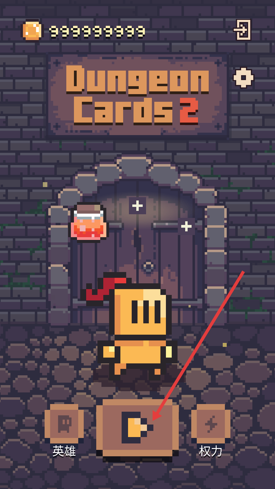 1、点击红色箭头指向的中间按钮,进入【地下城卡牌2】游戏。