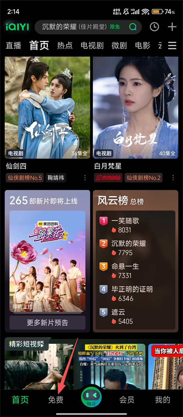 1、打开爱奇艺App,点击底部【免费】选项,便能进入免费内容页面,开启找漫画的旅程啦。