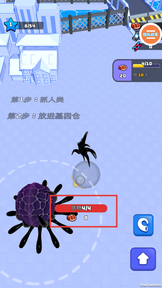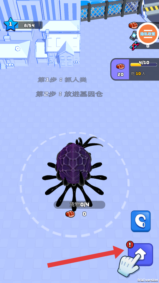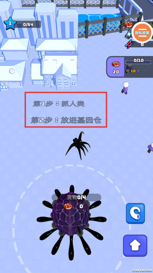 1、进入游戏,依照提示,先操控角色执行【第1步:抓人类】,并将抓到的人类放入【基因仓】。
