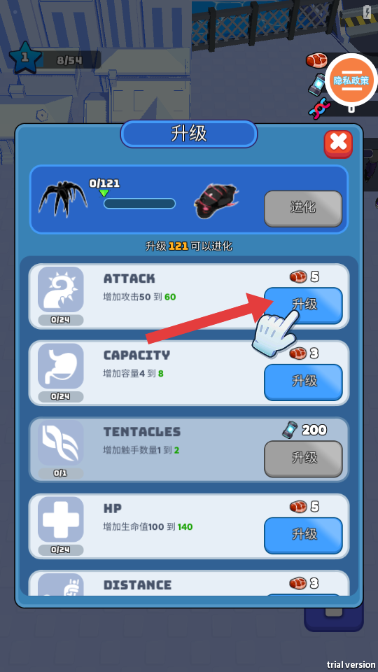 3、放置基因仓后,将会获得经验,点击右下角【向上箭头】进入升级界面。