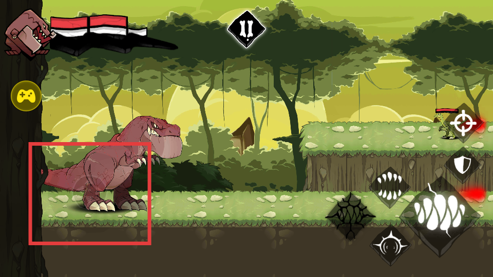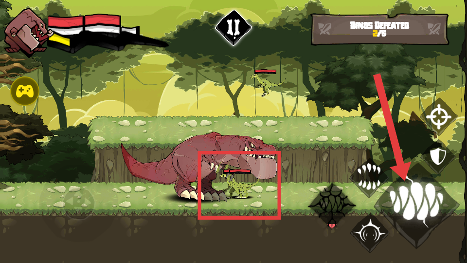 3、面对红框内的小型恐龙,及时点击右侧拳头技能图标发起攻击,借助MOD菜单提升的攻击效率,快速推进【DINOS-DEFEATED】进度。