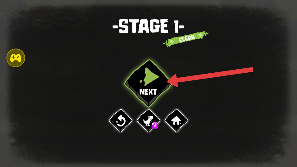 4、完成【STAGE-1】后,点击【NEXT】按钮进入下一关,通过MOD菜单解锁更多关卡和恐龙,持续挑战。