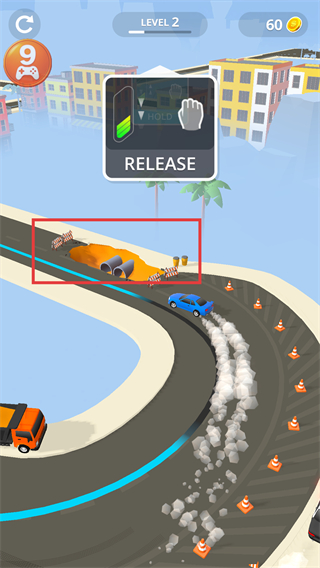 3、根据提示“RELEASE”,在合适的时机释放操作,控制赛车顺利通过弯道和障碍物区域。