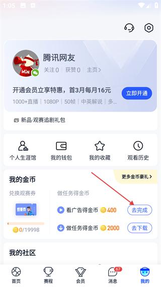 2、在个人页面中,找到【我的金币】板块,点击对应任务的【去完成】按钮。