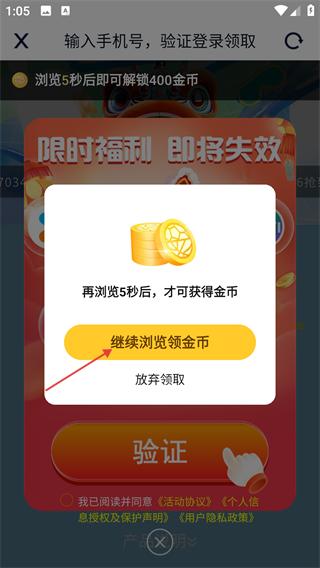 3、按提示参与任务(如看广告领金币),进入任务页面后完成对应操作。