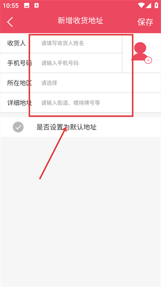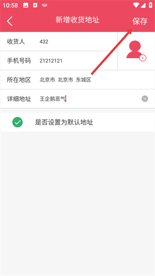 4、填写完地址信息后,点击右上角【保存】按钮,即可完成收货地址添加操作。