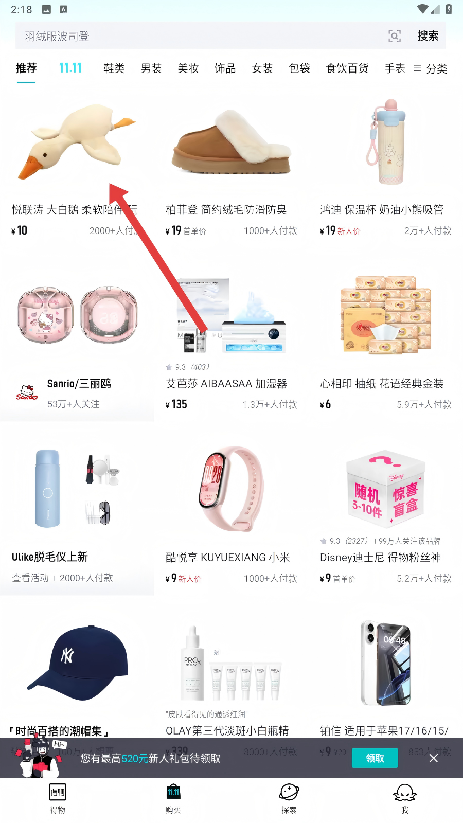 2、在购买页面里,我们浏览各类商品,看到心仪的,比如【大白鹅玩偶】,就点击它进入详情页咯。