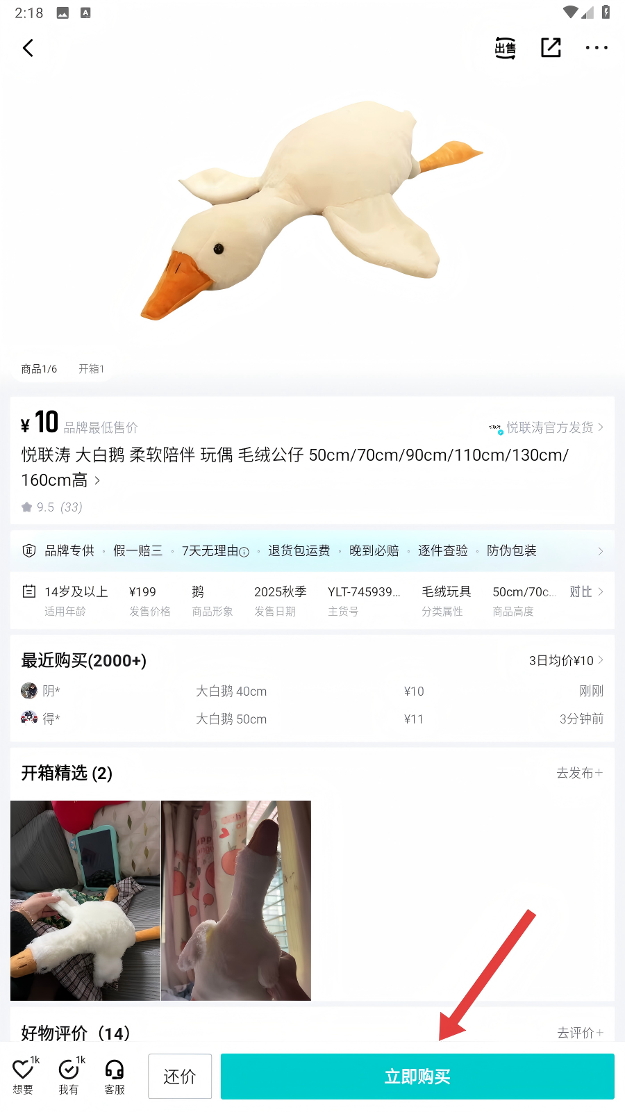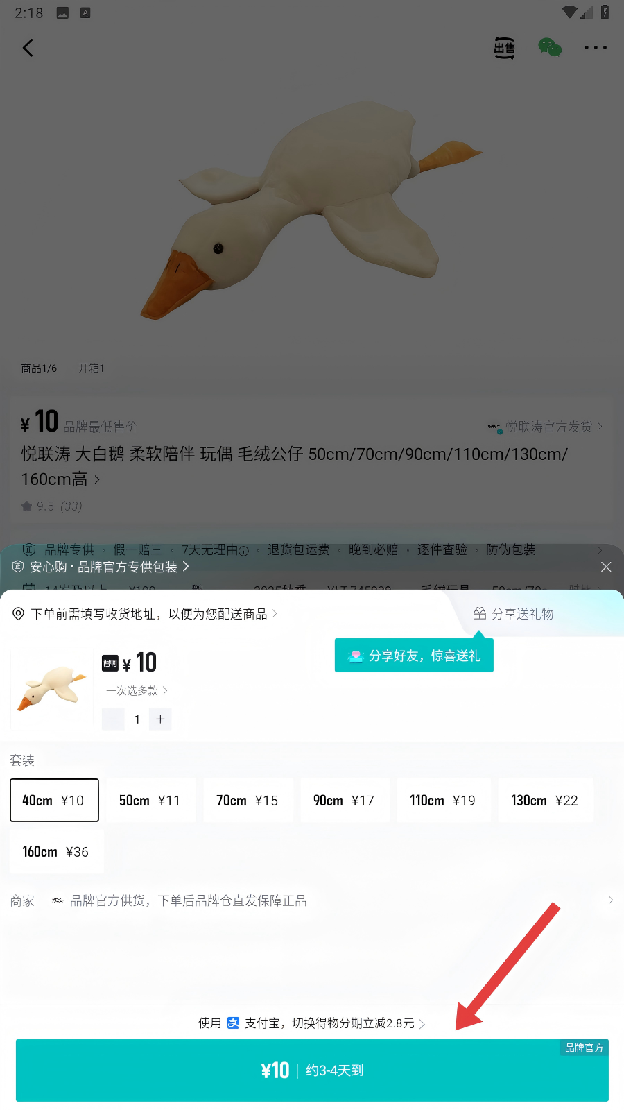 4、接着选择商品规格,像大白鹅的尺寸等,选好后点击底部显示价格的支付按钮,就能完成购买啦。