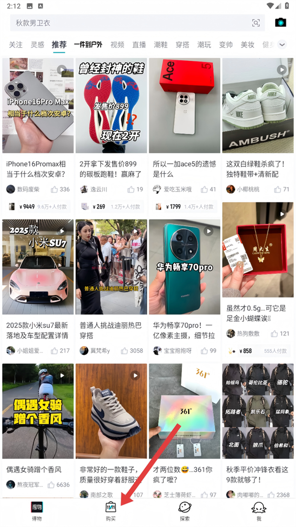 1、我们打开得物App,点击底部【购买】按钮,进入商品选购页面呀。