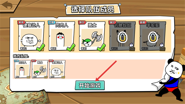 1、在【选择队伍成员】界面,挑选已解锁的【健身达人】【肉人】等单位组成队伍,点击【开始游戏】进入关卡。