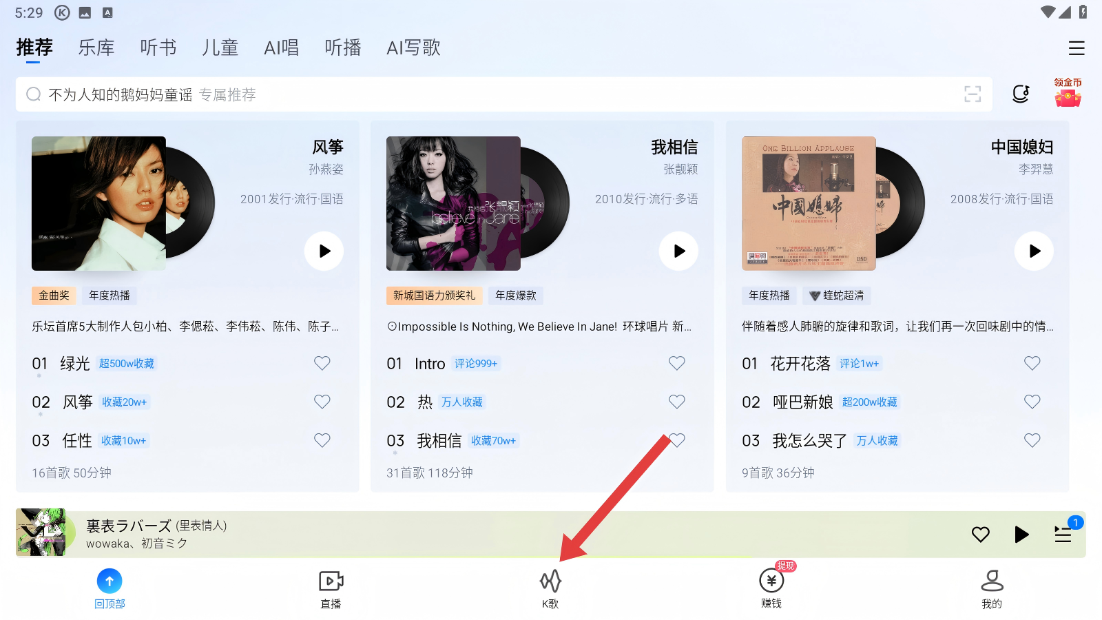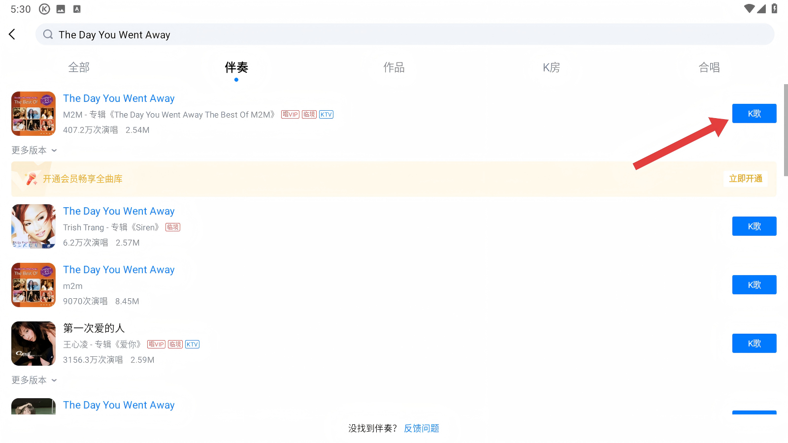 4、找到对应的歌曲后,点击歌曲右侧的【K歌】按钮,就能开始进行演唱啦。