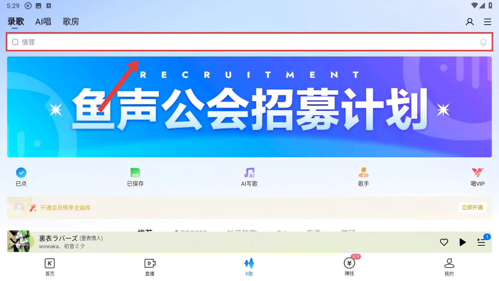 2、在K歌页面的搜索框中,输入想要演唱的歌曲名称,方便快速找到目标歌曲呢。