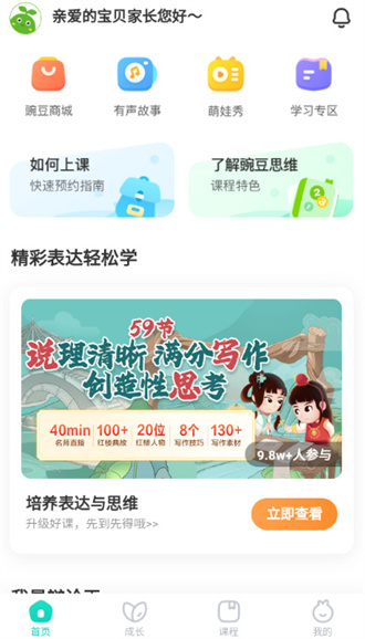 豌豆素质家长端是为豌豆素质的学生家长提供的可以用来实时关注孩子学习成绩的软件,家长可以在这里看到孩子们的学习情况,更加清楚孩子的学习,也更方便和老师们进行沟通,玩法功能全面的教学学习软件等你来使用,来规划学习的计划课程,很方便的掌握到学习的进度信息内容,家长通过学习的来更好的调整后面的学习计划,让学习变得更加科学,有利于培养孩子的学习兴趣。