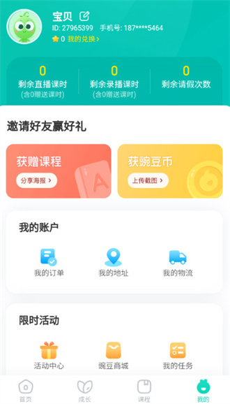4、我的中心中可以看到各种剩余的课程课时,还能对于自己的账户信息进行查看。