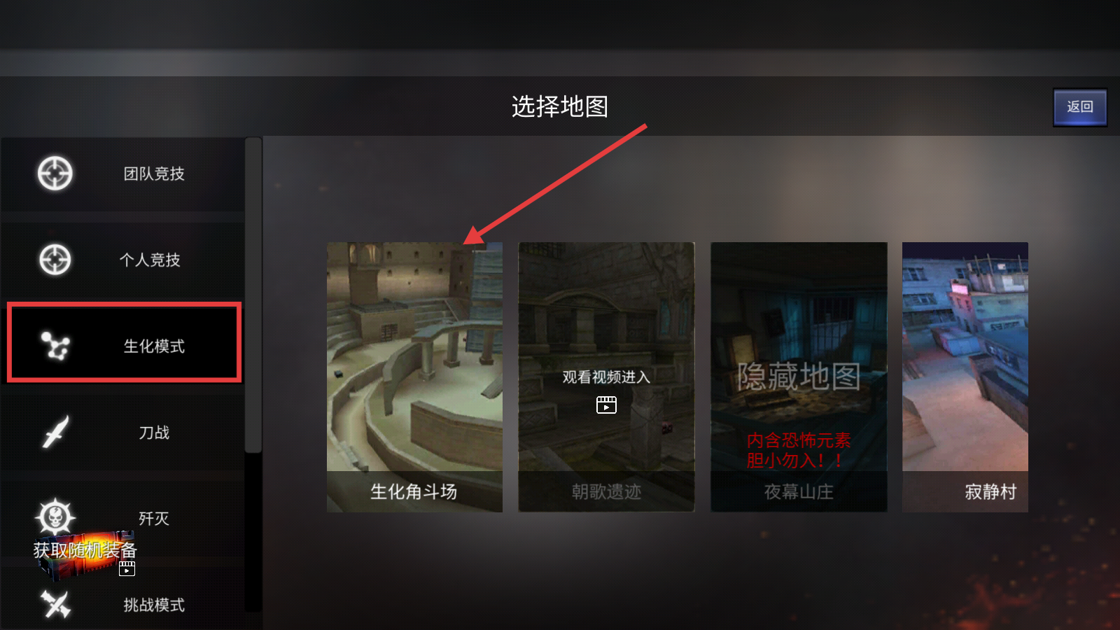 1、进入【生化模式】后,优先选【生化角斗场】地图,熟悉其结构,为后续周旋或攻击幽灵打好基础。