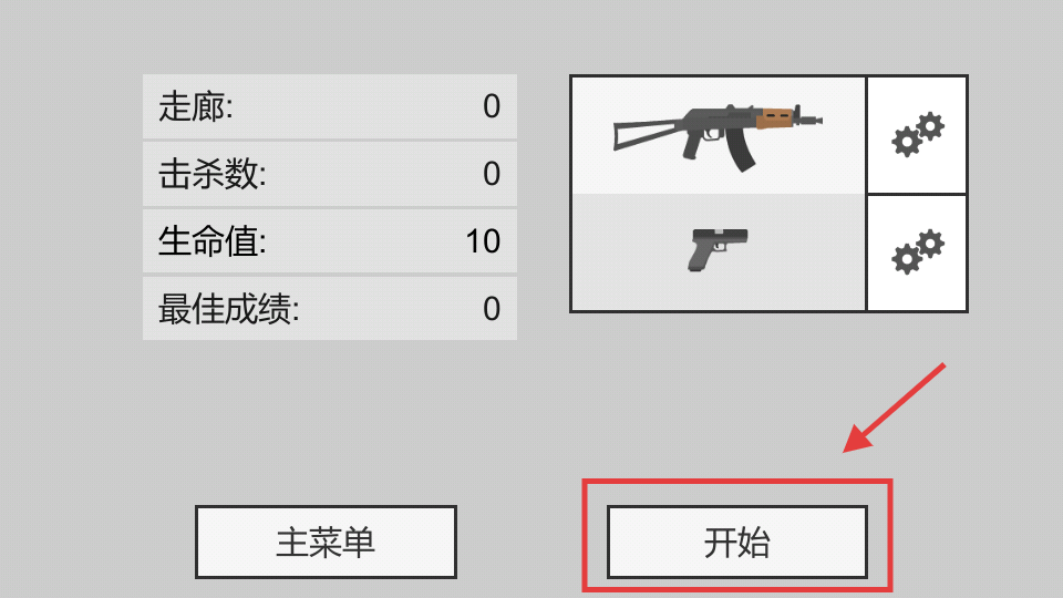 1、点击“开始游戏”按钮,进入游戏准备界面,可查看武器、数据后开启僵尸防御挑战。