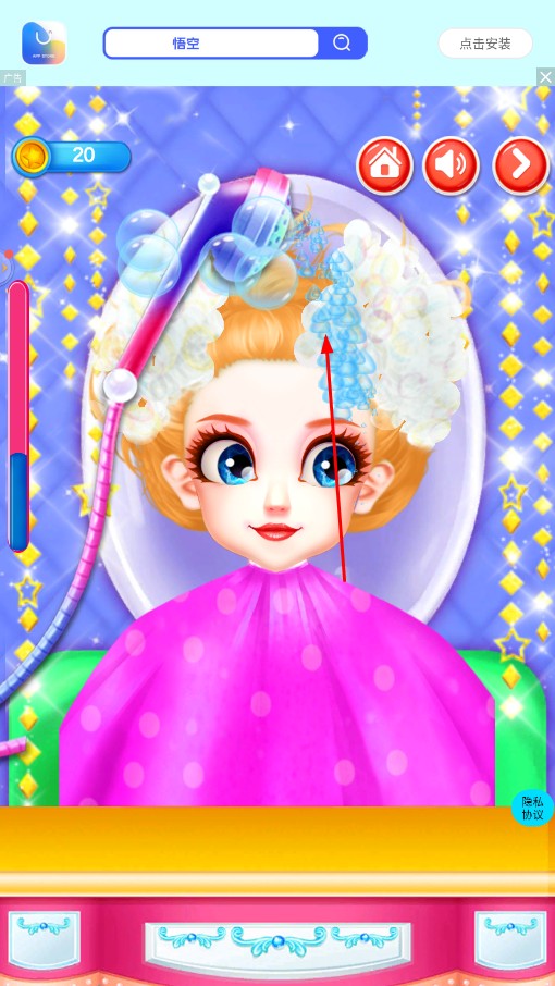 3、进入美发环节,使用工具给角色的头发打出泡沫并冲洗,清洁头发。